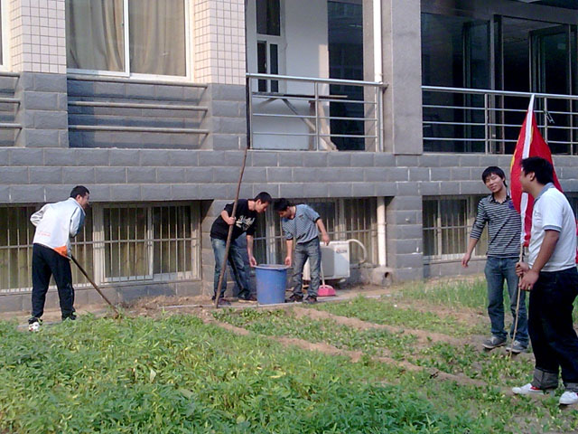 由于基建等原因,学院草坪内积聚了许多石块和碎玻璃,墙角、树丛下有多处卫生死角,打扫起来十分困难,只能用手一块块捡起来,有的同志衣服被划破,手指被划伤,但同志们毫无怨言,埋头苦干,圆满完成清扫任务。
