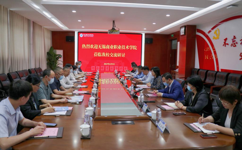 6月5日上午,无锡商业职业技术学院院长徐汉文一行来校考察交流人才培养和师资队伍建设等方面工作。校党委书记李桂贞会见徐汉文一行。党政办、人事处、发展规划处、财务处、审计处、教务处和智能制造学院等相关部门负责人参加会见。