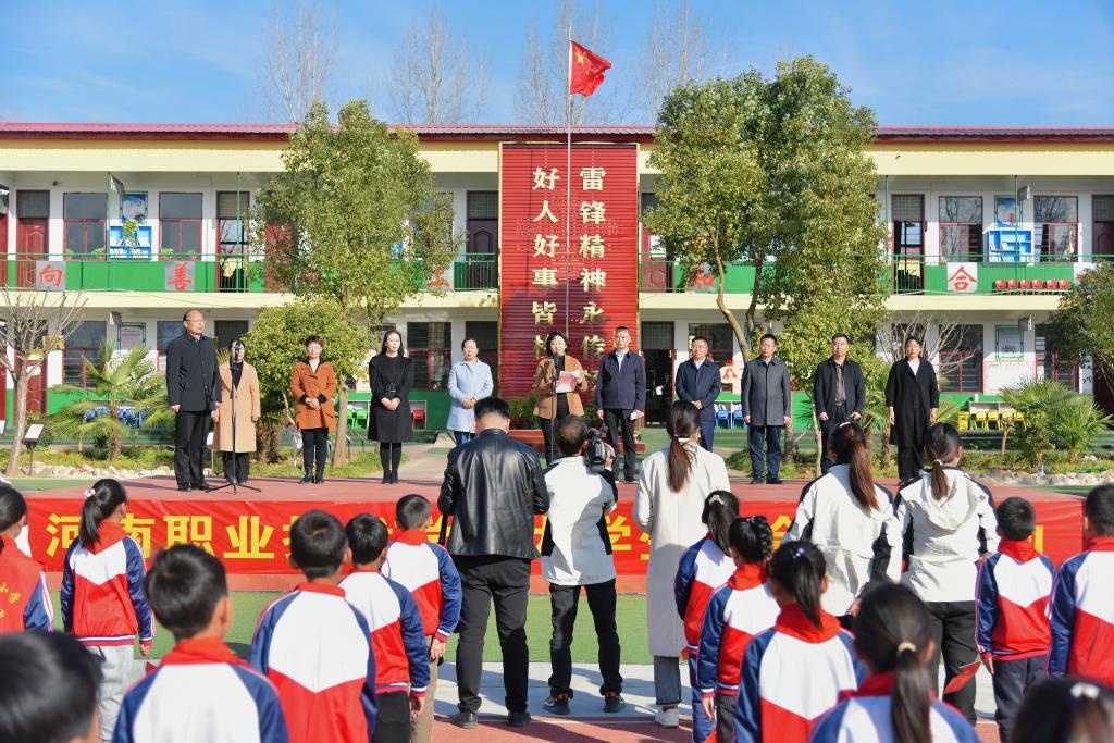 在朱耀环小学,夏新颜代表学校捐赠了价值3万元的文体用品,并寄语全体学生:一要树立大志向,勇于逐梦想。从小学先锋、长大做先锋。眼中星光璀璨,向着梦想奔跑,对未来充满信心,做好学生、好孩子,好少年。二要胸怀大世界,学习伴成长。保持对知识的渴望,对探索的兴趣,勤于思考,多学多问,努力成长为祖国建设、家乡发展的有用之才、栋梁之材。三要养成好习惯,锻炼好身体。加强体育锻炼,争做热爱运动、阳光自信的少年,努力成为德智体美劳全面发展的社会主义建设者和接班人。李晓勇和朱耀环小学校长王艳霞对学校捐赠慰问表示感谢,并希望学校依托职业教育资源助力舞阳教育事业发展。期间,学校国旗护卫队举行了升旗仪式,学校马克思主义学院、团委授牌朱耀环小学大学生社会实践基地和送教工作站,仪式在师生激情嘹亮的《让我们荡起双桨》歌声中结束。随后,双方师生开展了丰富多彩的实践活动。
