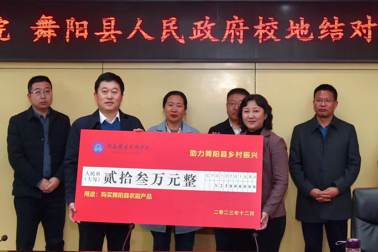 12月8日,校长夏新颜带队赴舞阳县签署校地帮扶框架协议,购买23万元舞阳县农副产品,在朱耀环小学举行捐赠和社会实践等活动。学校党委副书记、纪委书记田华,舞阳县县委副书记、县纪委书记、县监委主任孔德余,县委常委、宣传部长、副县长李晓勇,副县长李江峰参加上述活动。