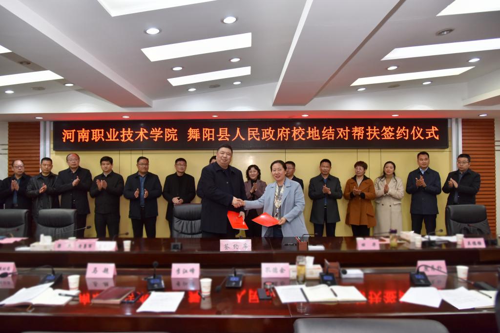 在签约仪式上,夏新颜总结回顾了校地结对帮扶工作5年来所取得的成绩,介绍了学校今年在教育、文化、科技等方面的帮扶工作情况。夏新颜指出,校地结对帮扶是贯彻落实中央和省委关于脱贫攻坚和乡村振兴工作战略决策部署一项重要任务。5年来,学校充分发挥人才、科技、智力、培训等方面的优势,积极开展校地结对帮扶舞阳县脱贫攻坚、乡村振兴工作,帮扶工作取得丰硕成果。夏新颜希望双方以此次签约仪式为契机,进一步加强沟通协调,完善长效合作机制,为舞阳县各项事业的发展贡献河职力量。孔德余对学校多年来给予舞阳的大力支持和帮扶表示感谢,并希望学校继续发挥国家“双高计划”建设院校优势,加强在人才、培训、科技、教育和文化等方面的帮扶,进一步深化双方结对帮扶成果,推动舞阳县乡村振兴和经济社会高质量发展。随后,夏新颜与孔德余交接了消费帮扶牌匾,田华与李晓勇签署了校地帮扶乡村振兴框架协议。