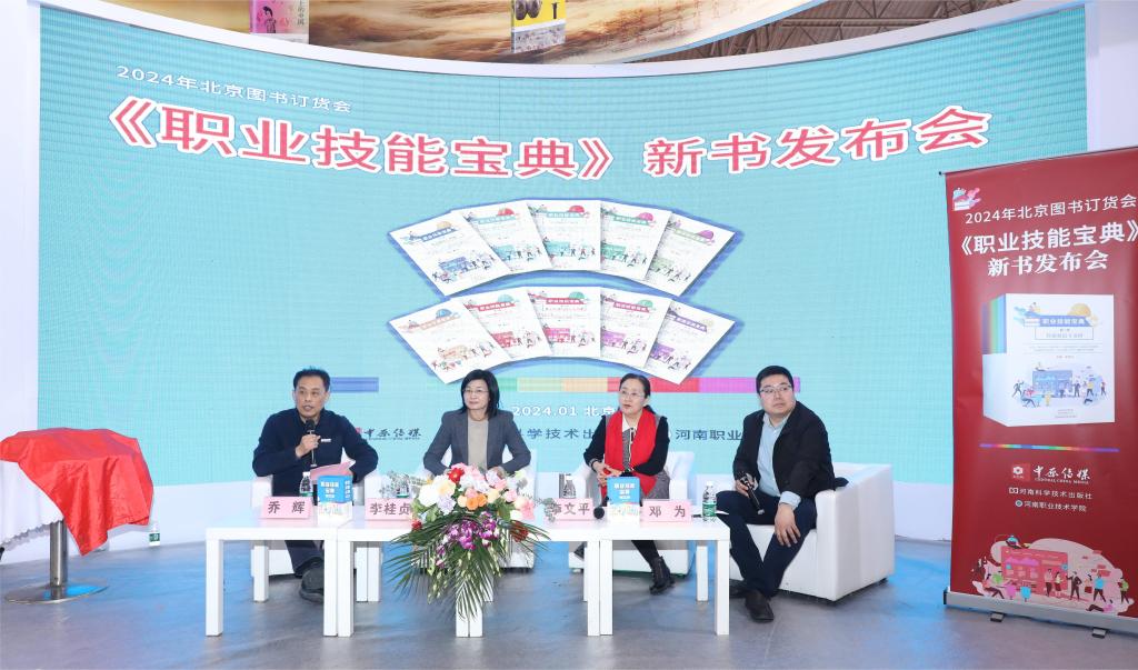 1月12日下午,第36届北京图书订货会期间,由bat365官网登录入口编制、河南科学技术出版社出版的《职业技能宝典》新书发布会在中国国际会展中心(朝阳馆)举办。学校党委书记李桂贞、中原出版传媒集团副总经理李文平、河南科学技术出版社社长乔辉等嘉宾出席发布会。