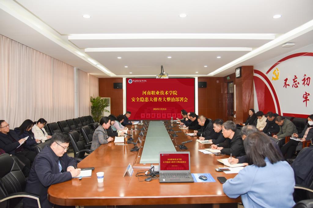 1月21日下午,学校安全隐患大排查大整治部署会在行政楼332会议室召开。校党委书记李桂贞,校长夏新颜,校党委副书记、纪委书记田华,副校长李玉峰和任枫轩出席会议。党政办、宣传部、学工部、后勤处、保卫处、基本建设处、综合实训中心及各二级学院党政主要负责人参加会议。会议由田华主持。