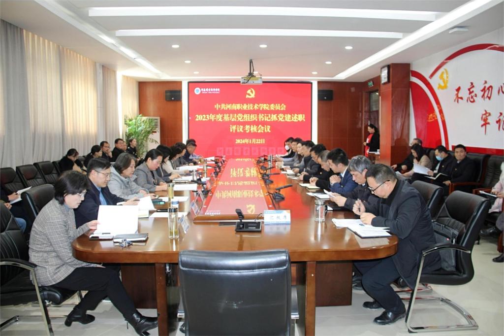 1月22日下午,河南职院在行政楼332会议室召开2023年度党组织书记抓基层党建工作述职评议考核会议。校党委全体成员,各党总支书记、副书记,直属党支部书记,党政办、组织部、宣传部、纪检监察室、工会、团委、学工部、人事处等部门负责同志及各二级学院党支部书记代表共55人参加会议。会议由校党委书记李桂贞主持。