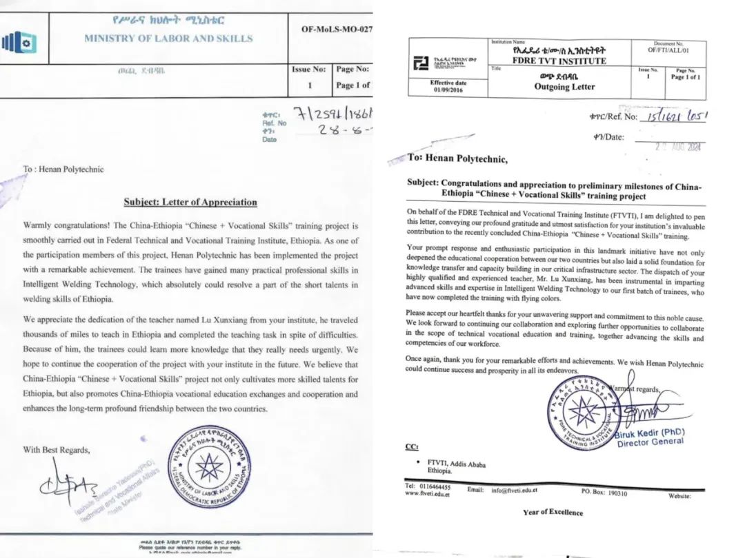 9月9日,学校收到了来自埃塞俄比亚劳动与技能部和联邦技术职业培训学院的感谢信。感谢学校为中国-埃塞俄比亚“中文+职业技能”项目所做的贡献,感谢经验丰富、热情耐心的鲁训祥老师传授了先进的智能焊接技能技术和专业知识。