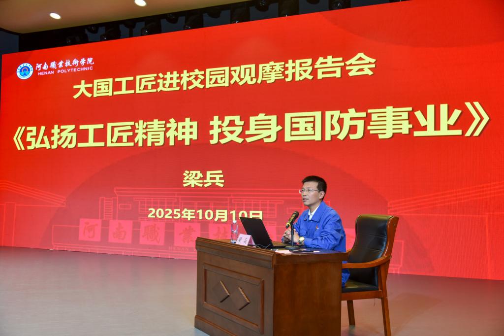 专题报告环节,梁兵结合自身扎根军工一线经历,以丰富实践经验、扎实专业功底,分别从“传承工匠精神,唯守方能出新”“坚持岗位创新,科技强军立业”“继承劳模精神,建功企业发展”等三个方面,为现场师生带来一场精彩纷呈的思想启迪课。整场报告深入浅出,既具备理论高度,又贴近学生实际,以生动案例、鲜活故事,全方位展现新时代产业工人精神风貌,诠释新时代产业工人的责任与担当,让在场师生深刻领悟工匠精神独特魅力。师生们纷纷表示,这是一场既有深度又有温度的高水平报告,在聆听故事的过程中,对“技能报国”四个字有了更深刻地理解和感受,更坚定了投身技能强国实践的决心与信心,今后将持续加强专业基础,锤炼实践能力,努力成为新时代需要的高素质技术技能人才,为实现制造强国梦想贡献青春力量。