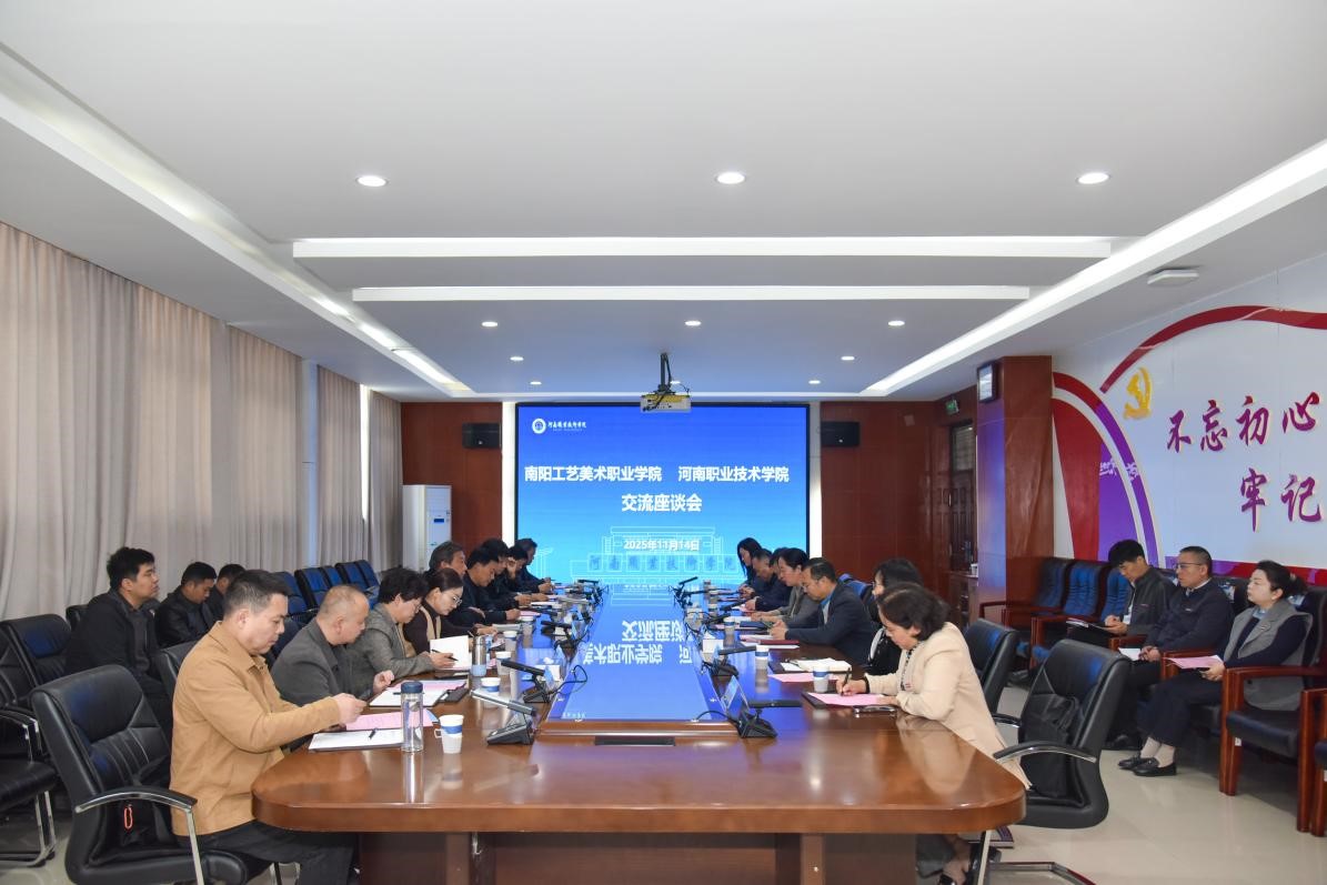 11月14日上午,南阳工艺美术职业学院党委副书记郭学中一行来校考察交流。校党委副书记、工会主席田华出席座谈会并讲话,相关职能部门和二级学院负责人参加座谈。座谈会由校党委委员、副校长朱永宽主持。