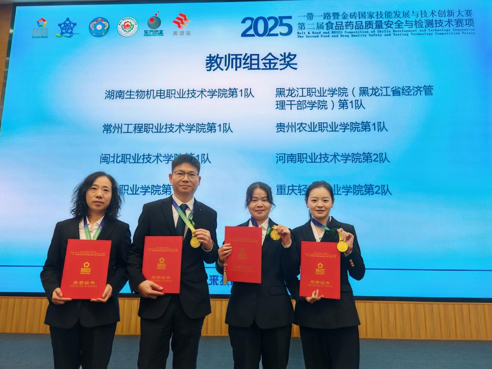 近日,2025“一带一路”暨金砖国家技能发展与技术创新大赛——第二届食品药品质量安全与检测技术赛项在湖南长沙举行。学校食品工程学院教师侯丽芬、崔萌甜、宁梦鸽、满勇组队参赛,凭借扎实的专业功底、精湛的操作技能与出色的团队协作,在全国76支教师参赛队伍中脱颖而出,荣获一等奖,展现了学校教师的卓越风采。