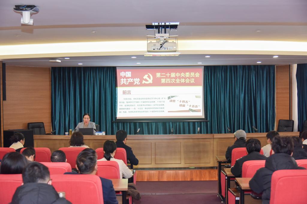为深入学习宣传贯彻党的二十届四中全会精神,根据校党委统一部署,12月8日下午,校党委副书记、工会主席田华走进经济管理学院,为学院师生宣讲党的二十届四中全会精神。经济管理学院党政领导班子成员、全体教职工及学生代表聆听报告。