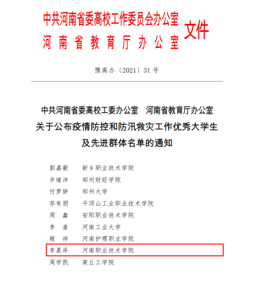 近日,为褒扬全省广大青年大学生在疫情防控和防汛救灾工作中的突出表现,中共河南省委高校工委办公室下发《关于公布疫情防控和防汛救灾工作优秀大学生及先进群体名单的通知》,我校李晨泽同学被授予“疫情防控和防汛救灾工作优秀大学生”荣誉称号。据悉,全省仅有25名大学生被授予“疫情防控和防汛救灾工作优秀大学生”荣誉称号。