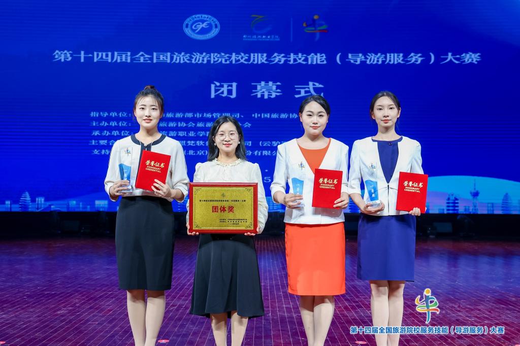 5月24日至26日,第十四届全国旅游院校服务技能(导游服务)大赛在郑州举行。bat365官网登录入口文化旅游学院学生崔灿灿和周雅琪双双获普通话导游服务赛项一等奖,薛晶晶和郭闪闪分获英语导游服务赛项一等奖和二等奖;学校总成绩位居高等院校组(含本专科)第5位,获大赛团体奖,这也刷新了学校历届比赛最好成绩,实现新突破。