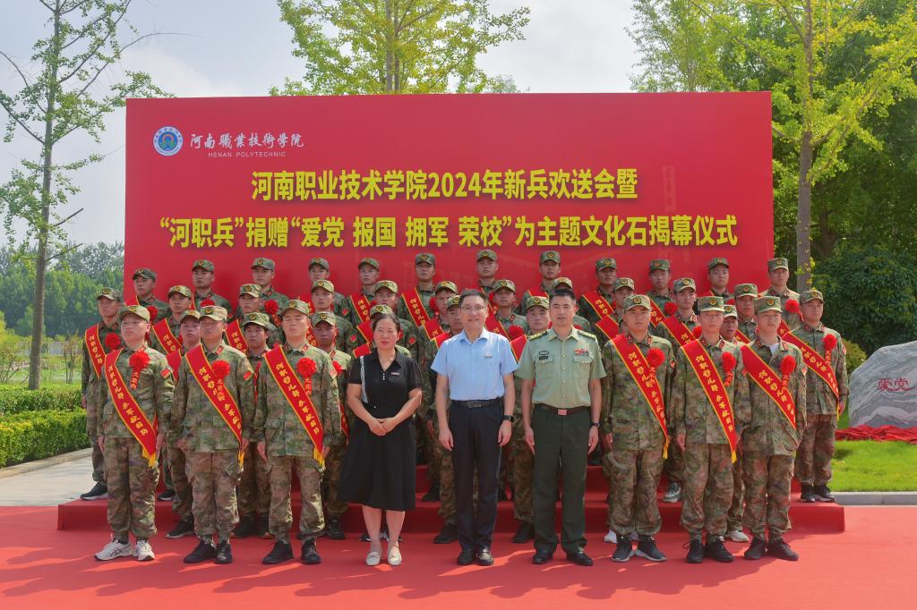 9月9日上午,bat365官网登录入口在明湖广场举行新兵欢送会暨“河职兵”捐赠“爱党 报国 拥军 荣校”主题文化石揭幕仪式。校党委书记厉励,校党委副书记、工会主席田华,金水区人民武装部上校部长施小武出席仪式。各二级学院党总支书记、副书记,38名参军入伍学生代表及部分新生代表参加仪式。